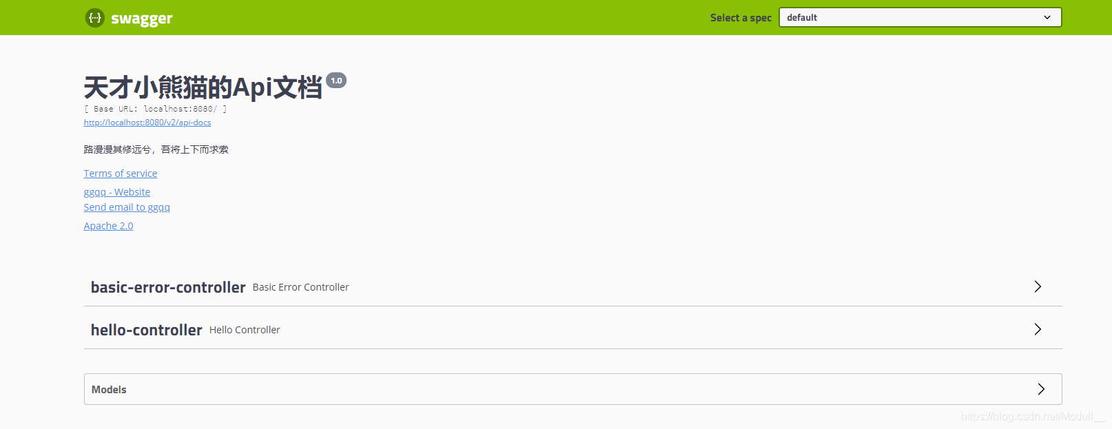//配置Swagger信息 private ApiInfo apiInfo(){ //作者信息 Contact contact = new Contact("ggqq", "https://blog.youkuaiyun.com/Mcdull__?spm=1001.2014.3001.5343", "30252579055@11.com"); return new ApiInfo( "天才小熊猫的Api文档", "路漫漫其修远兮,吾将上下而求索", "1.0", "https://blog.youkuaiyun.com/Mcdull__?spm=1001.2014.3001.5343", contact, "Apache 2.0", "http://www.apache.org/licenses/LICENSE-2.0", new ArrayList() ); } -