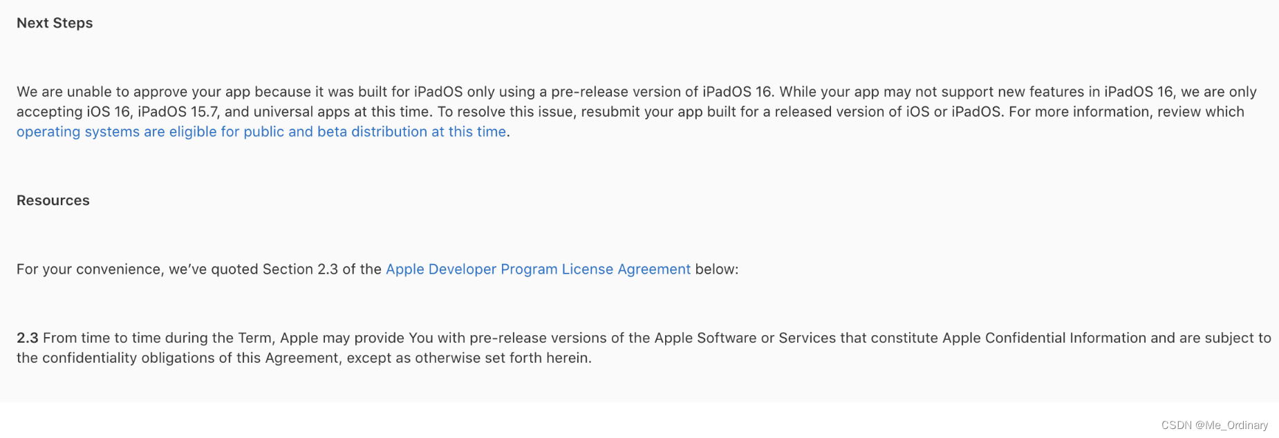 我们无法批准您的应用程序,因为它仅使用iPadOS 16的预发布版本为iPadOS构建。虽然您的应用可能不支持iPadOS 16中的新功能,但我们目前只接受iOS 16、iPadOS 15.7和通用应用程序。要解决此问题,请重新提交为发布版本的iOS或iPadOS构建的应用程序