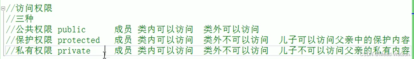 C++ 通过 public、protected、private 三个关键字来控制成员变量和成员函数的访问权限(也称为可见性),分别表示:公有的、受保护的、私有的。