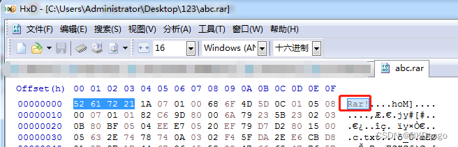 - 拖进hex里查看,发现头部被改(原rar头部应为Rar! Hex为:52 61 72 21)