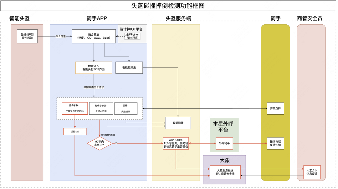 2)第二个被动安全能力——意外摔倒监护功能。交通事故是造成骑手和三者人身伤亡、财产损失的重要原因之一。当骑手不幸出现交通事故时,智能头盔不仅在物理上保护骑手,还可以通过传感器和相关算法识别事故的发生,同时联动前端和后台,实现: