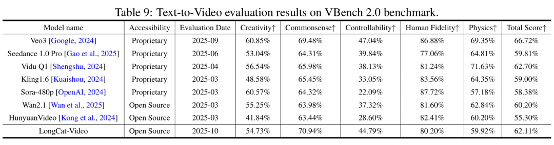 在 VBench 等公开基准测试中,LongCat-Video 在参评模型中整体表现优异。