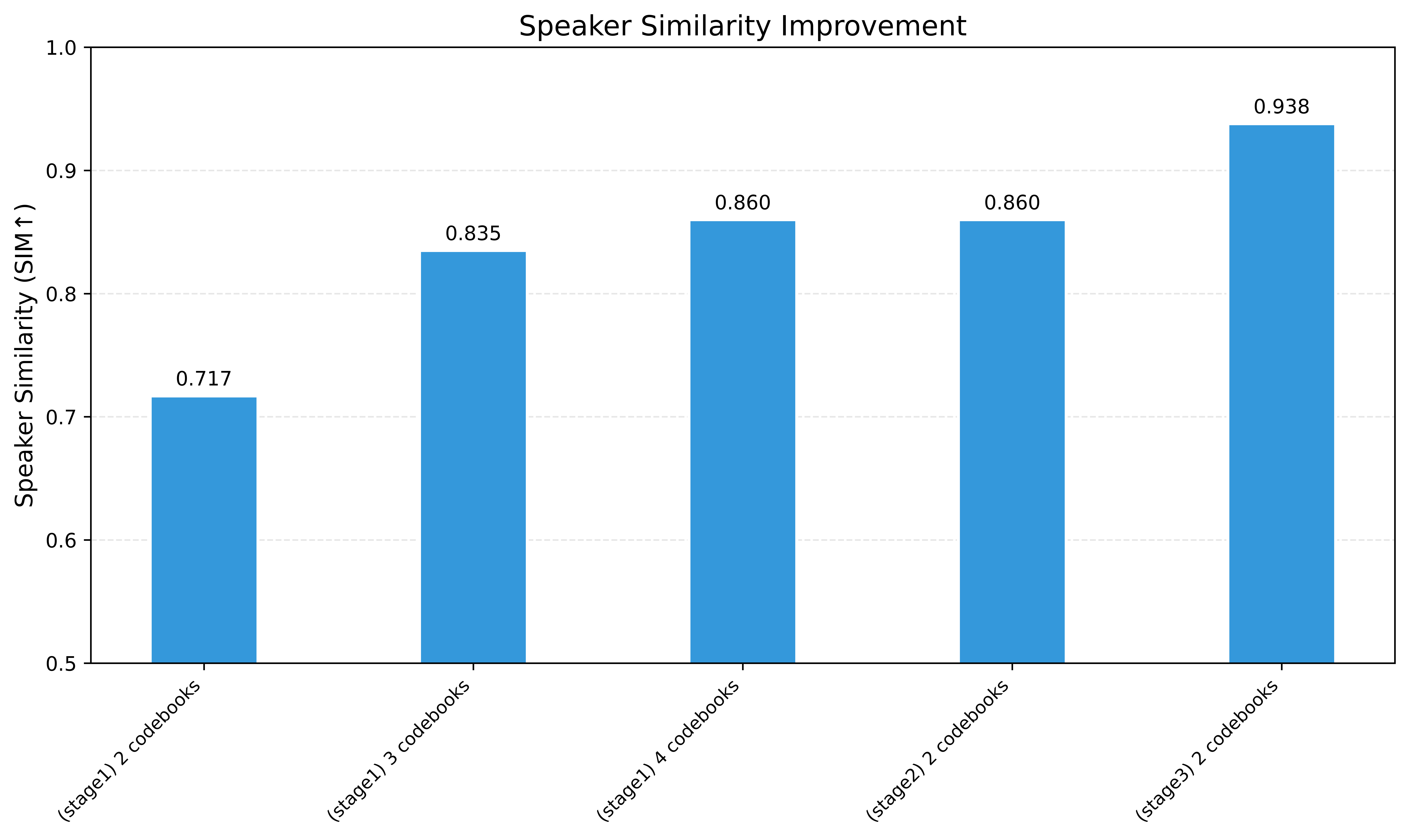 经过 Stage 3 优化后,有限集说话人相似度(SIM)从 0.717 升至 0.938,证明在当前架构下,使用最低码率(0.43kbps)下也可满足说话人定制需求。