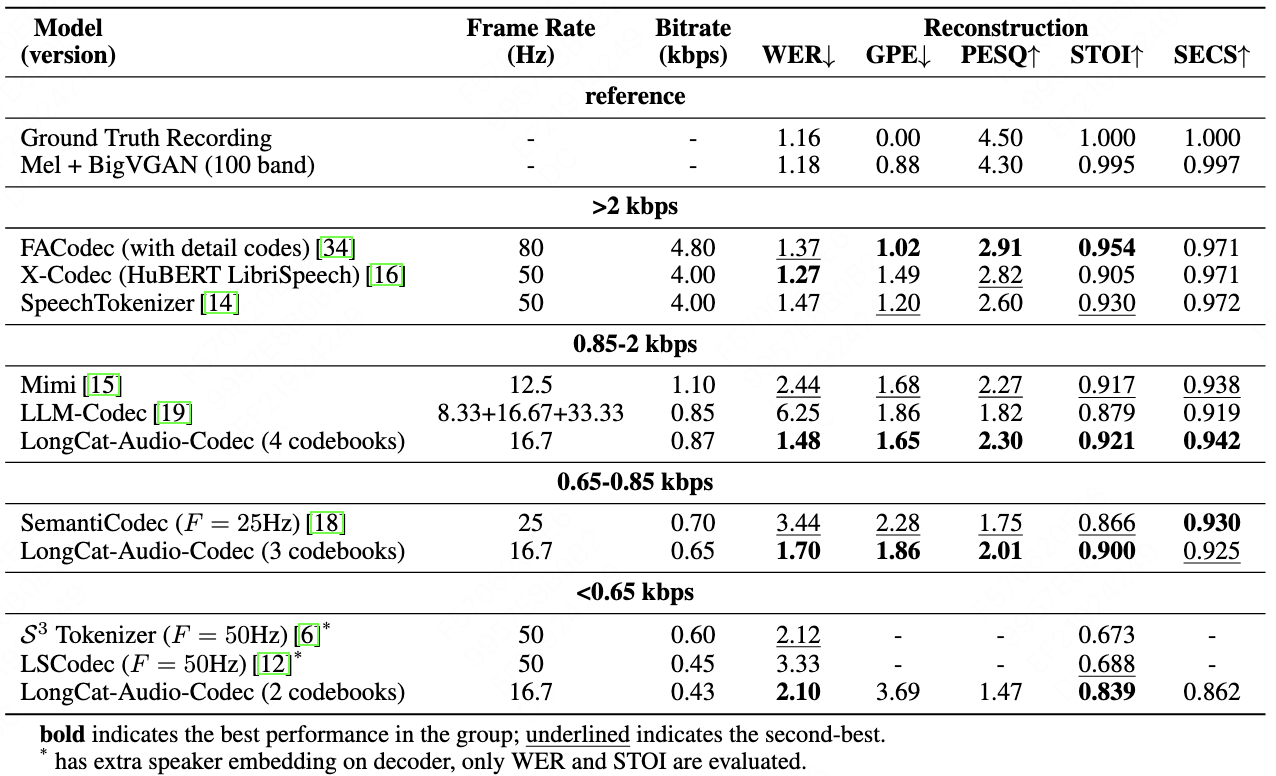 - <0.65kbps 区间(2 个码本,0.43kbps):WER 2.10,STOI 0.839,在极端低比特率下仍保持高可懂性,适合资源受限场景。