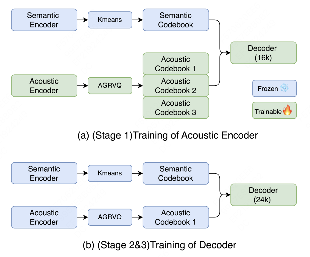 - 声学 Token:随后基于已有语义信息,结合改进的量化技术,在大码本空间下补充韵律、音色等副语言特征的声学 Token,解决非语义信息覆盖不足的问题。