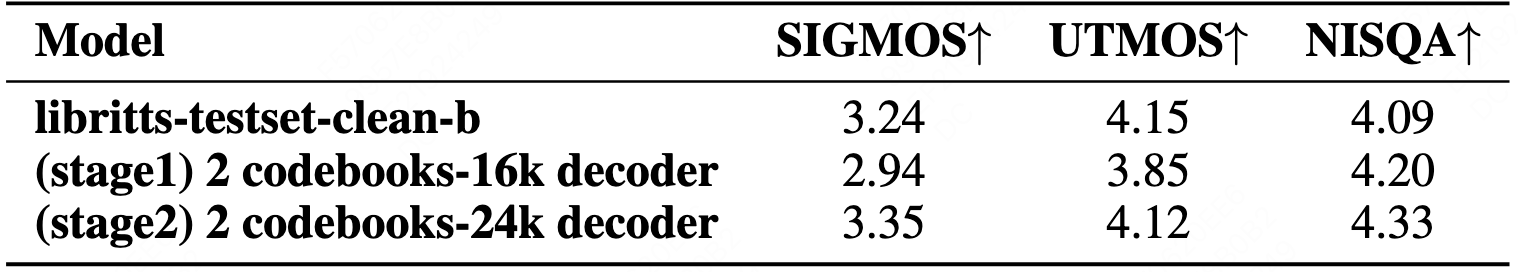 - 0.65-0.85kbps 区间(3 个码本,0.65kbps):WER 1.70,STOI 0.900,优于同类低比特率方案;