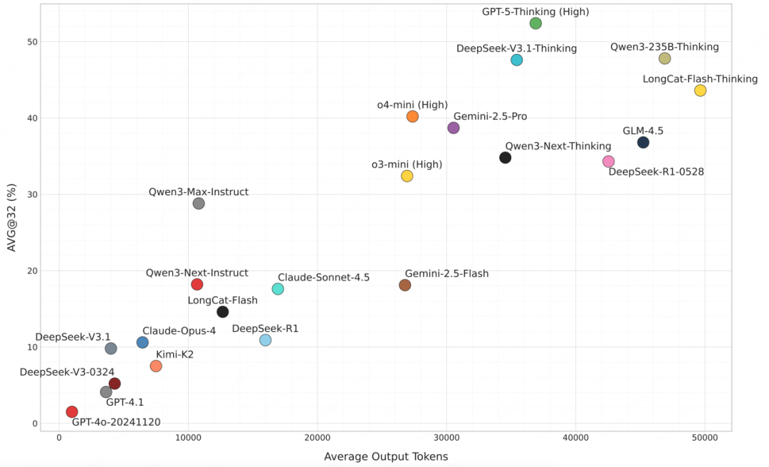 高得分模型依赖更多 token 输出:AVG@32 超 40% 的模型(如 GPT-5-Thinking、DeepSeek-V3.1-Thinking),平均输出 token 量均超 35K,意味着当前的头部推理模型能通过构建显著更长的逻辑链来达到更好的解题表现。