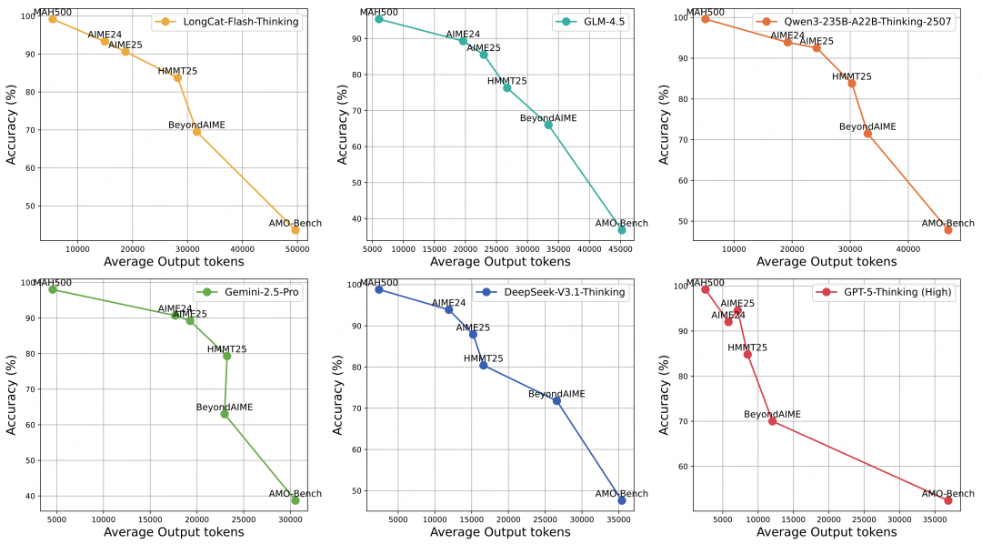 通过对比大模型在AMO-Bench和现有数学评测集上的输出长度,可以看到,随着数据集难度的提升,模型表现在逐渐走低的同时,其输出 token 数量也会大幅增加。