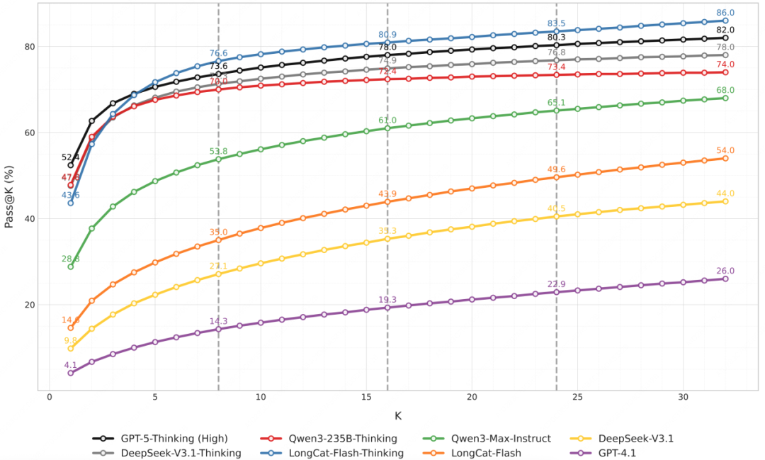 通过进一步分析模型的 “Pass@k” 表现(k 次尝试至少答对 1 次),LongCat 团队指出,前沿推理模型如 GPT-5-Thinking(High)、DeepSeek-V3.1-Thinking 等在 AMO-Bench 上能达到 Pass@32 超 70%,表明当前大模型暗含解决难题的潜力,其性能仍有巨大提升空间。