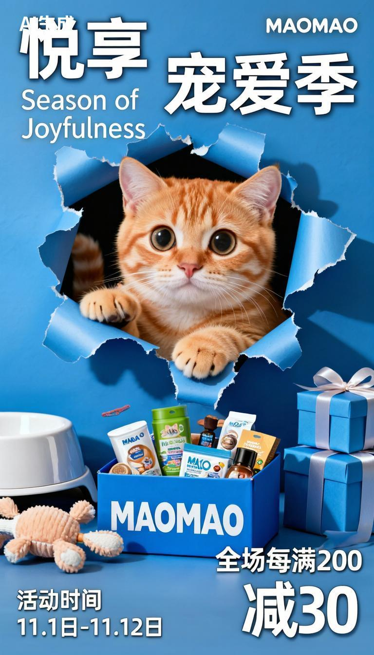 Prompt:一张以蓝色为主色调的促销海报,宣传的是宠爱季活动,右上角品牌为 “MAOMAO”。画面中央,特写一只非常可爱的大眼睛橘猫从克莱因蓝色的撕开的纸中探出,大猫头萌萌的眼神特写,前爪伸向下方装满各类宠物用品的带有 “MAOMAO” 蓝色盒子。左侧有白色的猫碗,旁边还有一个毛茸茸的宠物玩具。右侧堆叠着带有丝带的蓝色礼盒。上方有白色的 “悦享宠爱季” 大字,左侧有 “Season of Joyfulness” 文字。左下角标注活动时间“11.1日-11.11日”,右下角有 “全场每满200 减30” 的白色文字,背景是纯净的克莱因蓝色,整体构图围绕宠物和促销活动展开,充满温馨欢快的氛围。