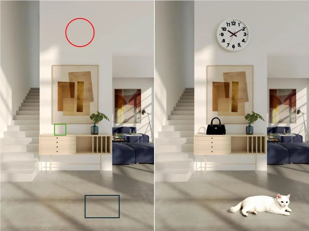 Prompt:在红色圈添加一个白色的钟表,绿色框添加黑色的手提包,黑色框添加一只白色的猫