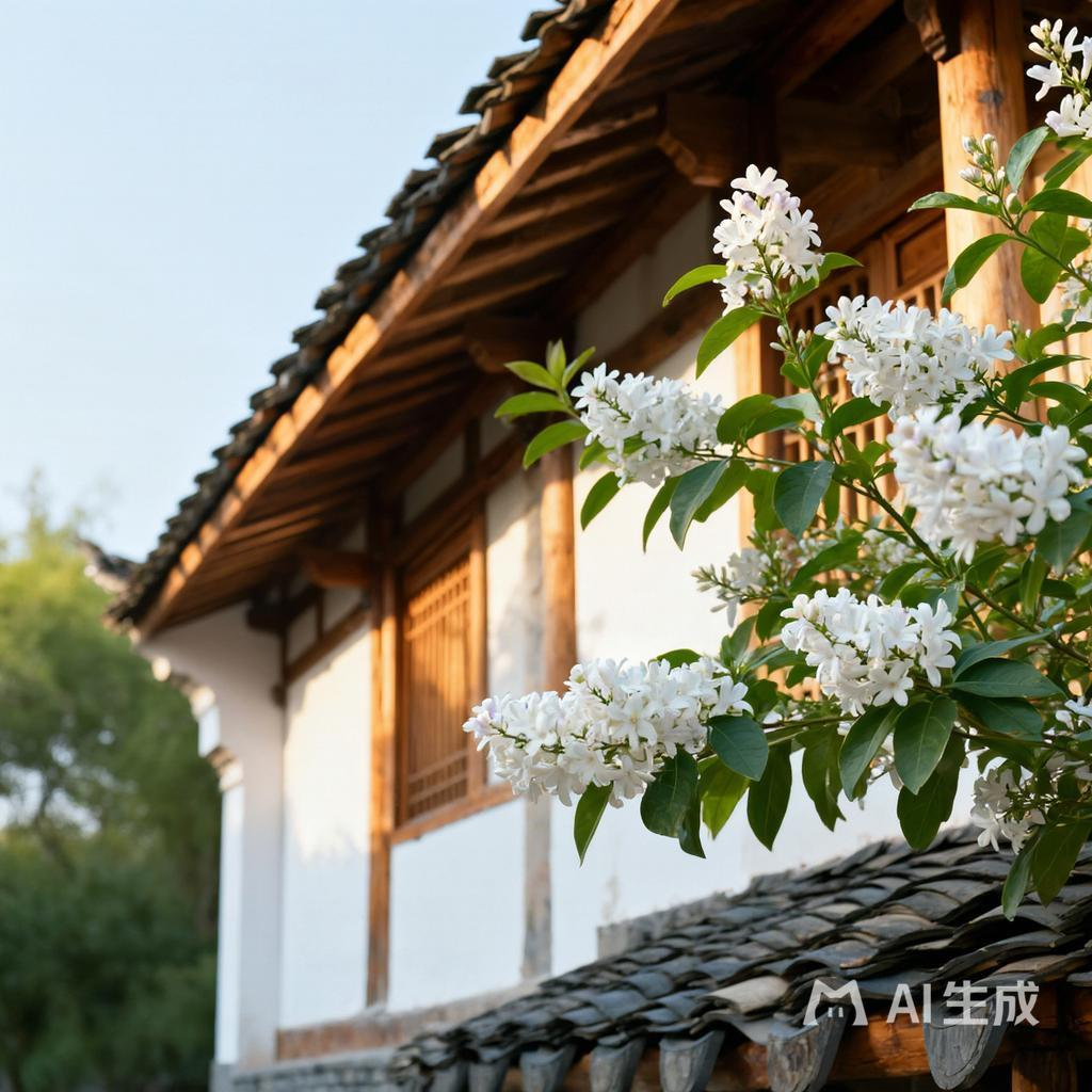Prompt:高清,白墙青瓦,吊脚楼一角,木香花开好了,干净清新,氛围感,艺术感,风景。