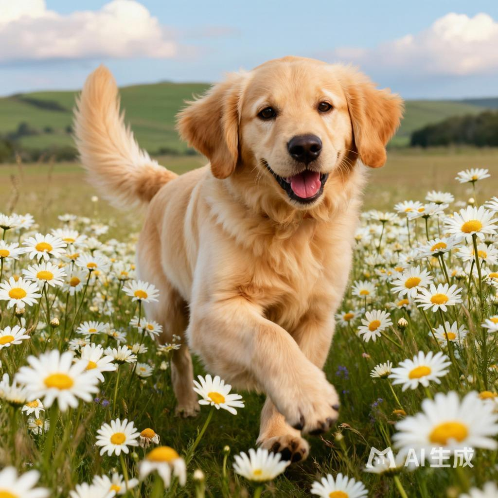 Prompt:一只毛茸茸的金毛猎犬在雏菊地里玩耍