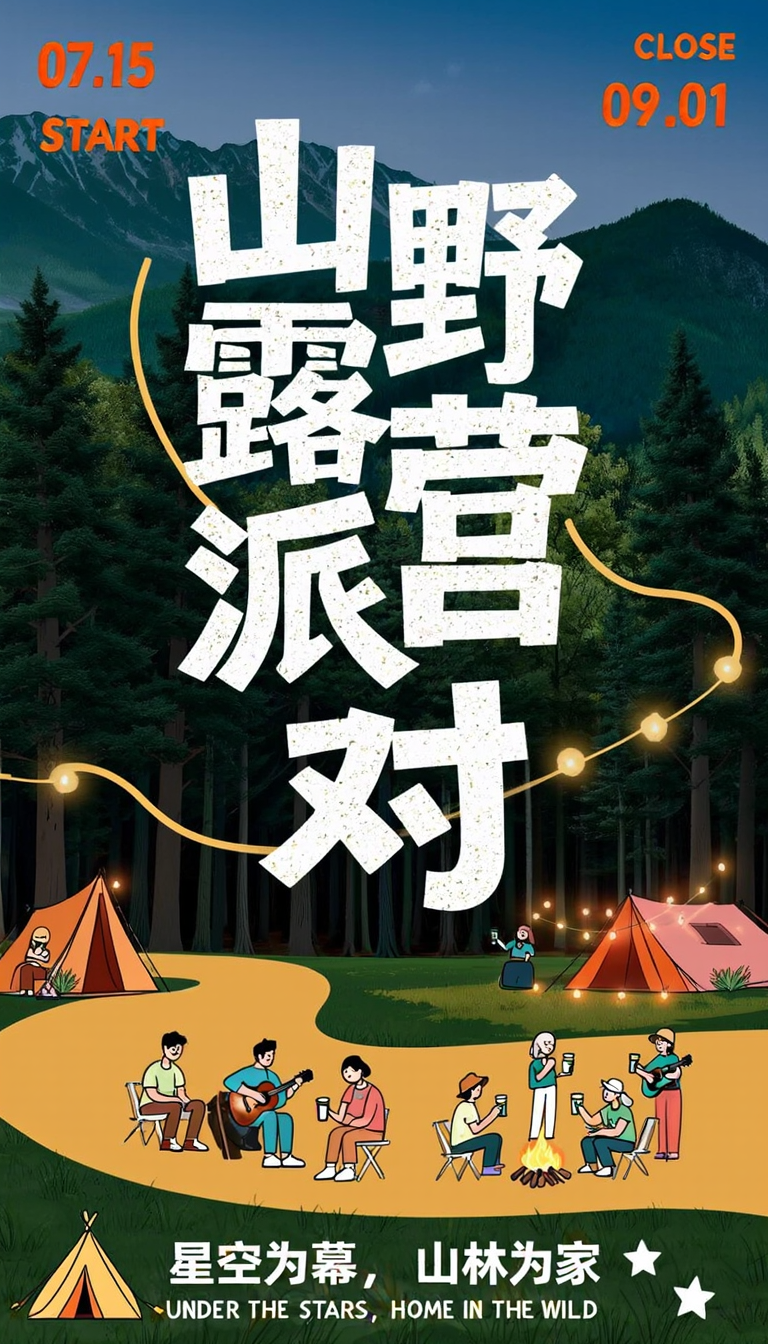 Prompt:海报设计以自然山野为背景,展现夏日露营活动的宣传画面。采用竖版布局,视觉重心集中在中央的巨大白色粗文字“山野露营派对”,字体粗犷有力,带有颗粒质感,与背景的森林和远山相呼应。文字之间穿插着暖黄色蜿蜒线条,象征林间小径或灯火,连接画面元素,形成流动感。主体是茂密的树林与开阔的草地,营造自在惬意的户外氛围。文字下方的暖黄色路径上,有多个简笔插画人物:有人搭帐篷、有人生篝火、有人举杯聊天,还有人弹吉他,展现露营乐趣,增强互动性与沉浸感。颜色以绿色和大地色为主调,辅以深蓝夜空和暖黄、橙红灯光与帐篷,视觉层次分明且温暖。左上角和右上角分别标注活动时间“07.15 START”和“CLOSE 09.01”,用橙色字体突出显示。底部文字“星空为幕,山林为家”及英文翻译“UNDER THE STARS, HOME IN THE WILD”简洁有力,旁边有帐篷与星星图案。风格融合自然摄影与插画元素,通过大胆文字排版和动态线条,传递自在舒适的户外露营体验氛围,是兼具美感与信息传达功能的优秀海报作品。