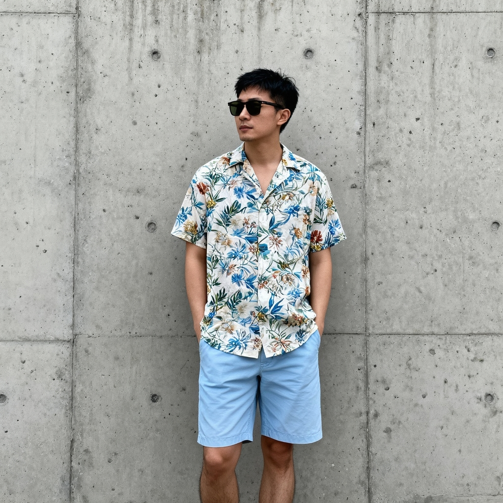 Prompt:一个留着短发、亚洲男性的单个人站在一面混凝土墙前。他穿着短袖花卉衬衫和浅蓝色短裤。这位男士戴着太阳镜。背景是一面朴实的混凝土墙,提供了一种中性的背景。这幅图像以肖像摄影风格捕捉,采用标准镜头视角和平视拍摄角度。绘画风格写实,具有高对比度和冷色调。图像明亮并且照明良好,强调主题的服装和姿势。