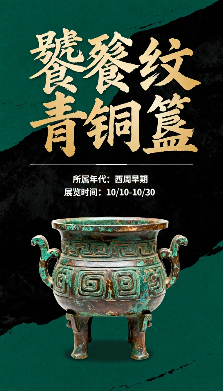 Prompt:A promotional poster for a museum exhibition, featuring a rustic deep green and black palette as the background, creating a sophisticated and historical atmosphere. At the center of the poster is a bronze vessel with a cylindrical shape and two ornate handles, showcasing intricate details and a rich patina that highlights its ancient craftsmanship. Above the vessel, bold calligraphic gold lettering reads “饕餮纹青铜簋”, adding an elegant and prestigious touch to the design. Below the vessel, in smaller text, are two lines: “所属年代:西周早期” and “展览时间:10/10-10/30”, providing essential information about the exhibit. The composition is balanced, with the vessel as the focal point, surrounded by the harmonious color palette that enhances the historical significance of the artifact. The overall design conveys a sense of timelessness and cultural heritage, inviting viewers to explore the exhibition.