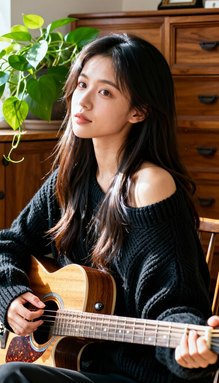 Prompt:年轻女性坐姿,半身像,手持吉他。女性穿着宽松的黑色毛衣,肩部微露,头发披肩,长发自然落下。背景为室内环境,光线柔和,周围有木质家具和绿植点缀,整体氛围舒适且安静。光线从左侧射入,营造出温馨的室内场景。