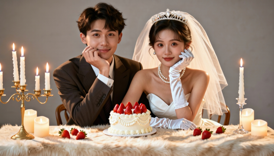 Prompt:一对年轻情侣坐在毛绒桌布前,正视前方,男性穿西装,女性身穿白色婚纱,佩戴珍珠项链和头纱,双手戴白色长手套。她的姿态优雅地支撑在桌上,右手手指微张。桌上摆放着一只奶油草莓蛋糕,周围散落几颗草莓。左侧有金色烛台,右侧有白色蜡烛,光线柔和,增添了一丝浪漫氛围。背景为浅灰色墙壁,被柔和的焦点光环衬托。全图光照柔和,整体氛围温馨且梦幻。