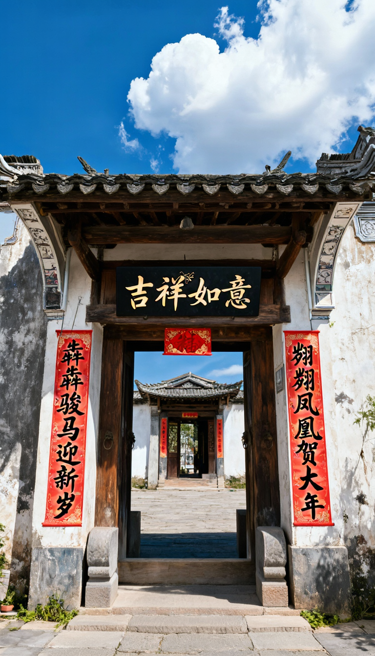 Prompt: 一座古色古香的传统中式门楼,平摄视角,上方悬挂着一块写有“吉祥如意”的黑色牌匾,字体庄重古朴。门楼两侧的柱子上贴着“犇犇骏马迎新岁”和“翙翙凤凰贺大年”的黑体字红色春联。画面采用写实摄影风格,色彩鲜艳,细节清晰。门楼位于画面中央,以白色和灰色为主色调,搭配深色木质结构,纹理清晰可见。背景是蓝天白云,天空湛蓝,白云朵朵。正午的阳光从上方垂直照射下来,光线明亮均匀,突显建筑的立体感和历史沧桑感,营造出一种古朴典雅且具有浓厚历史感的氛围。