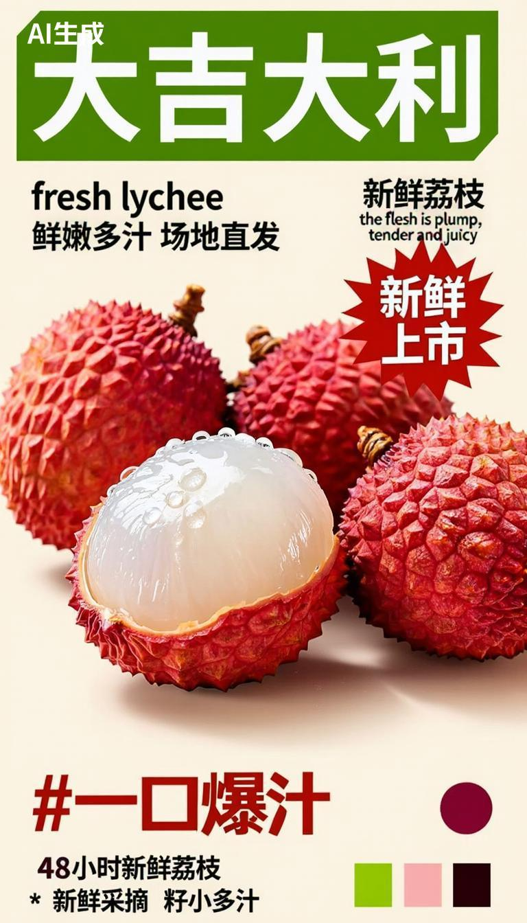 Prompt: 海报以浅米色为背景,中央展示几颗荔枝,其中一颗剥开,露出洁白多汁的果肉,突显荔枝的鲜嫩和多汁。上方绿色条幅上用大号白色字体写着“大吉大利”。下方标注“fresh lychee 新鲜荔枝 鲜嫩多汁 场地直发”。右上角有红色爆炸形标签,内写“新鲜上市”,旁边有英文描述“the flesh is plump, tender and juicy”。左下角红色文字“#一口爆汁”强调口感,下方小字说明“48小时新鲜荔枝 * 新鲜采摘 籽小多汁”。右下角有一些色块点缀。整体设计采用真实摄影风格,突出荔枝的新鲜和美味,吸引消费者注意。