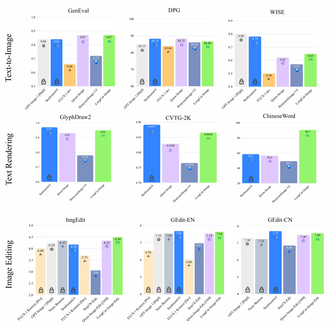 LongCat-Image 采用文生图与图像编辑同源的架构设计,并结合渐进式学习策略,在仅 6B 的紧凑参数规模下,实现了指令遵循精准度、生图质量与文字渲染能力的高效协同提升。尤其在单图编辑的可控性和文字生成的汉字覆盖度方面独具优势。