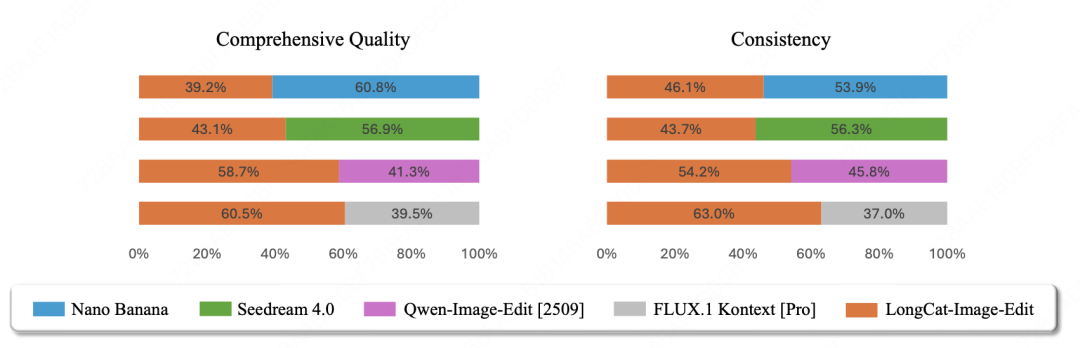 在文生图方面采用大规模的人工主观评分(MOS)方法,核心覆盖 文本-图像对齐、视觉合理度、视觉真实度、美学质量4个维度,LongCat-Image 的真实度相比主流开闭源模型表现出色,同时在文本-图像对齐与合理度上达到开源SOTA水平。在图像编辑方面采用严格的并列对比评估(Side-by-Side, SBS)方法,聚焦于综合编辑质量、视觉一致性这两个用户体验的维度,评测结果表明,LongCat-Image 虽然与 Nano Banana、Seedream 4.0 等商业模型存在一定差距,但显著超越了其他开源方案。