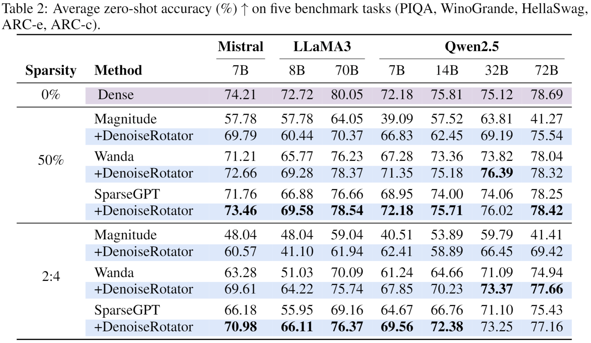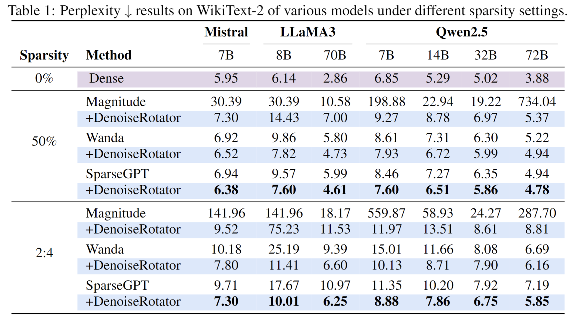 为全面评估DenoiseRotator的有效性,我们在多样化的实验设置下进行了系统性验证。实验覆盖了从Mistral-7B、LLaMA3(8B/70B)到Qwen2.5(7B/14B/32B/72B)等多个主流开源大模型,评测任务包括语言建模(使用WikiText-2验证集的困惑度PPL作为指标)和零样本推理(在PIQA、WinoGrande、HellaSwag、ARC-e和ARC-c五个基准任务上评估平均准确率)。在基线方法方面,我们将DenoiseRotator与三类剪枝方法结合:经典方法Magnitude,以及先进方法Wanda和SparseGPT,并在非结构化(50%稀疏)和半结构化(2:4稀疏)两种稀疏模式下进行对比评测。