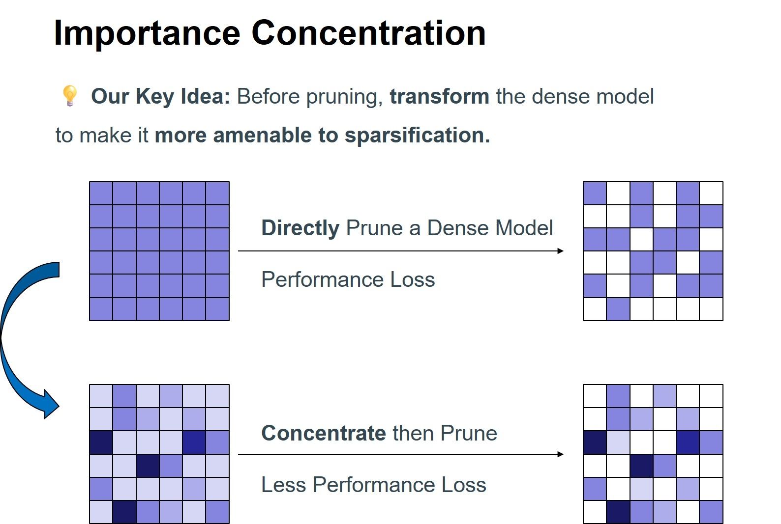针对上述挑战,我们重新思考剪枝范式:能否在剪枝前先对模型进行稀疏性引导的优化,使其自身结构更易于被剪枝? 基于此,我们提出了“重要性浓缩”的全新思路,并开发了DenoiseRotator框架予以实现。
