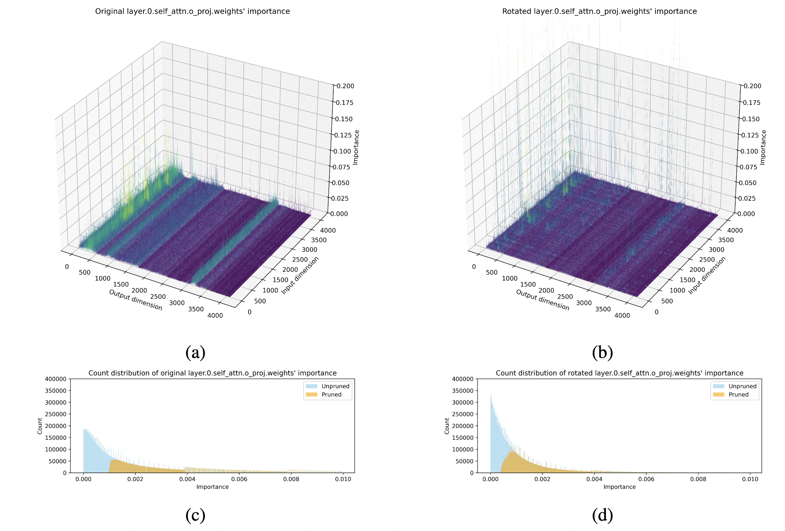 下图直观展示了DenoiseRotator的有效性。以LLaMA-3-8B模型首层输出投影层为例,经我们的方法变换后,参数重要性分布从分散趋于高度集中,为后续剪枝奠定了坚实基础。
