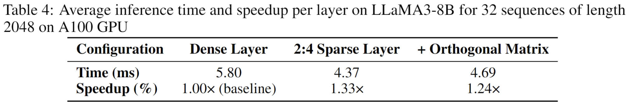 推理耗时:单层Transformer的2:4稀疏计算耗时4.37ms,加入正交矩阵后仅增加0.32ms(1.24×加速比 vs 稠密层)。