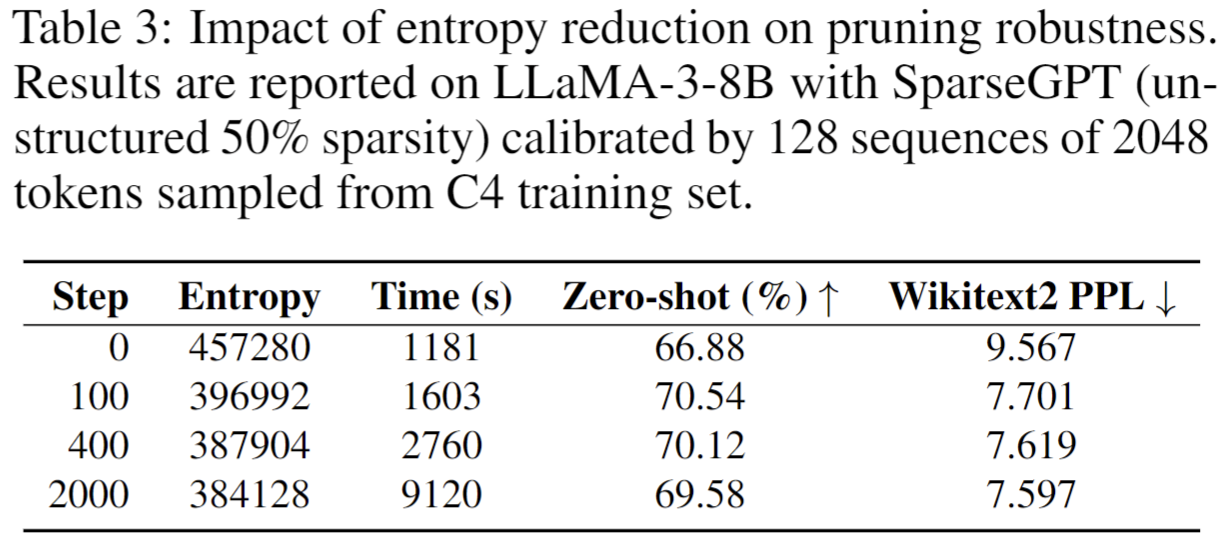 熵减少13%(步数100)即可带来零样本任务准确率提升3.66%(66.88%➡70.54%),困惑度降低19.5%(9.567➡7.701)。进一步优化可继续降低困惑度,验证了重要性集中度与剪枝鲁棒性的正相关。