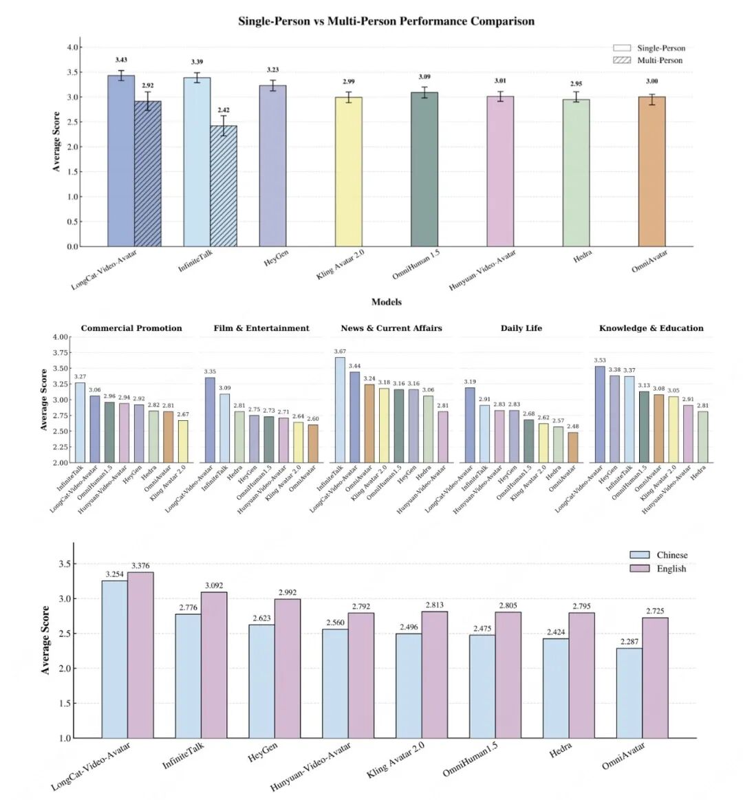 在涵盖商业推广、影视娱乐、新闻时事、日常生活和知识教育五大场景的单人对话测试中,LongCat-Video-Avatar 的综合评分领先于包括 InfiniteTalk、HeyGen、Kling Avatar 2.0 在内的众多主流开源与商业模型。