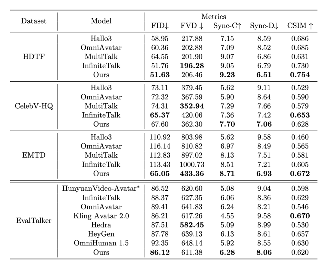 在 HDTF、CelebV-HQ 、EMTD 和 EvalTalker 等权威公开数据集上的定量评测表明,LongCat-Video-Avatar 在多项核心指标上达到SOTA领先水平。