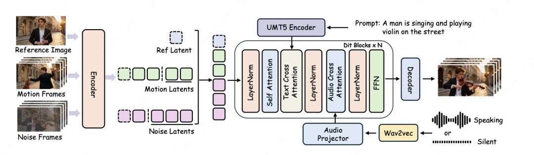 上一代 InfiniteTalk 在长视频生成中会出现视觉质量退化的现象,而VAE 的反复编解码是正是视觉质量退化的主要原因。现有方法通常将上一段生成结果解码为像素,再将末尾帧重新编码为潜变量,作为下一段的条件——这一“解码→再编码”循环会持续引入累积误差,导致色彩偏移与细节模糊。