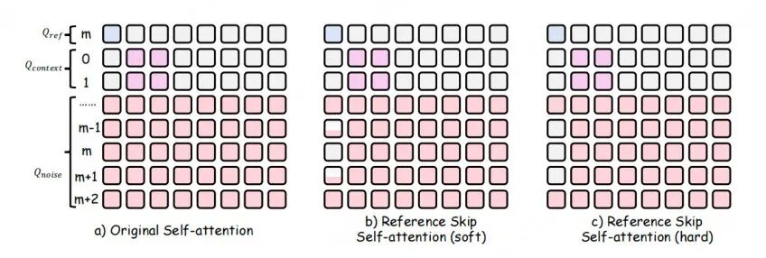 参考机制创新:我们引入了带位置编码的参考帧注入模式。推理时,用户可通过指定RoPE中的索引位置,灵活控制参考帧在生成块中的插入位置。更重要的是,我们设计了Reference Skip Attention机制,在参考帧相邻的时间步,屏蔽参考帧对注意力计算的直接影响,仅允许其提供身份语义先验,而不主导具体动作生成。这套机制在确保ID一致性的同时,有效抑制了动作的重复与僵化,使长视频既稳定又富有变化。