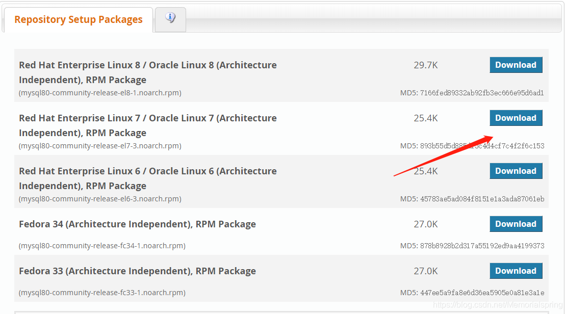 访问MySQL安装源地址:https://dev.mysql.com/downloads/repo/yum/ 下载源文件