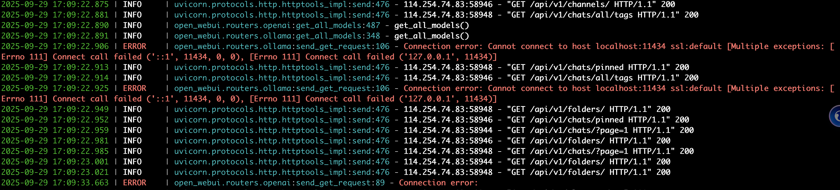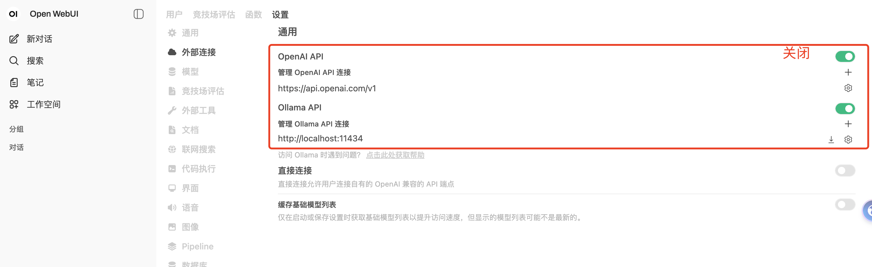 登录后:设置->管理员设置->外部连接。关闭OpenAI API 和 Ollama API, 或者配置本地已有的。