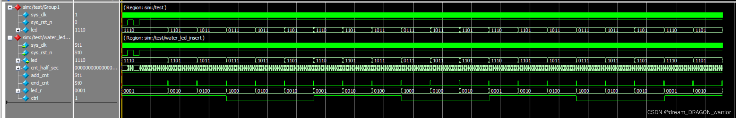 本文详细描述了一个名为water_led的Verilog模块,它使用参数化计数器和控制逻辑来控制LED输出。模块接受时钟(sys_clk)和复位(sys_rst_n)信号,以及一个LED输出。还包含一个测试模块展示如何驱动和验证此设计。