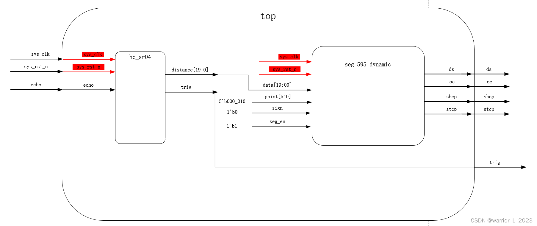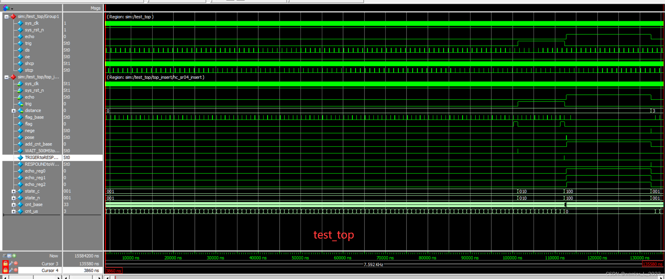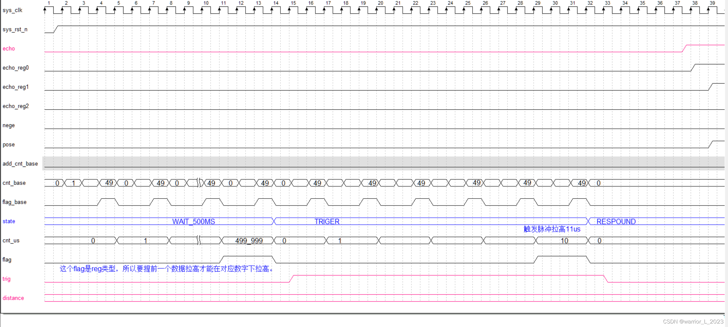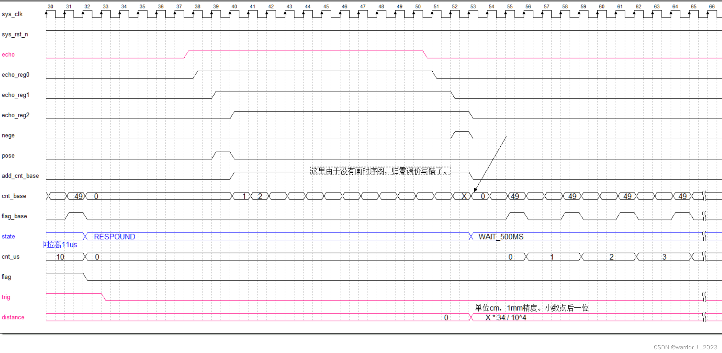 1,由于使用cnt_base 做echo回响信号高电平时间的测量,它的数据应该很大,位宽也很大。也可以采用cnt_us计数器,计算这个高电平时间的。我为了精确计算距离,所以才仍然用的cnt_base计数器。