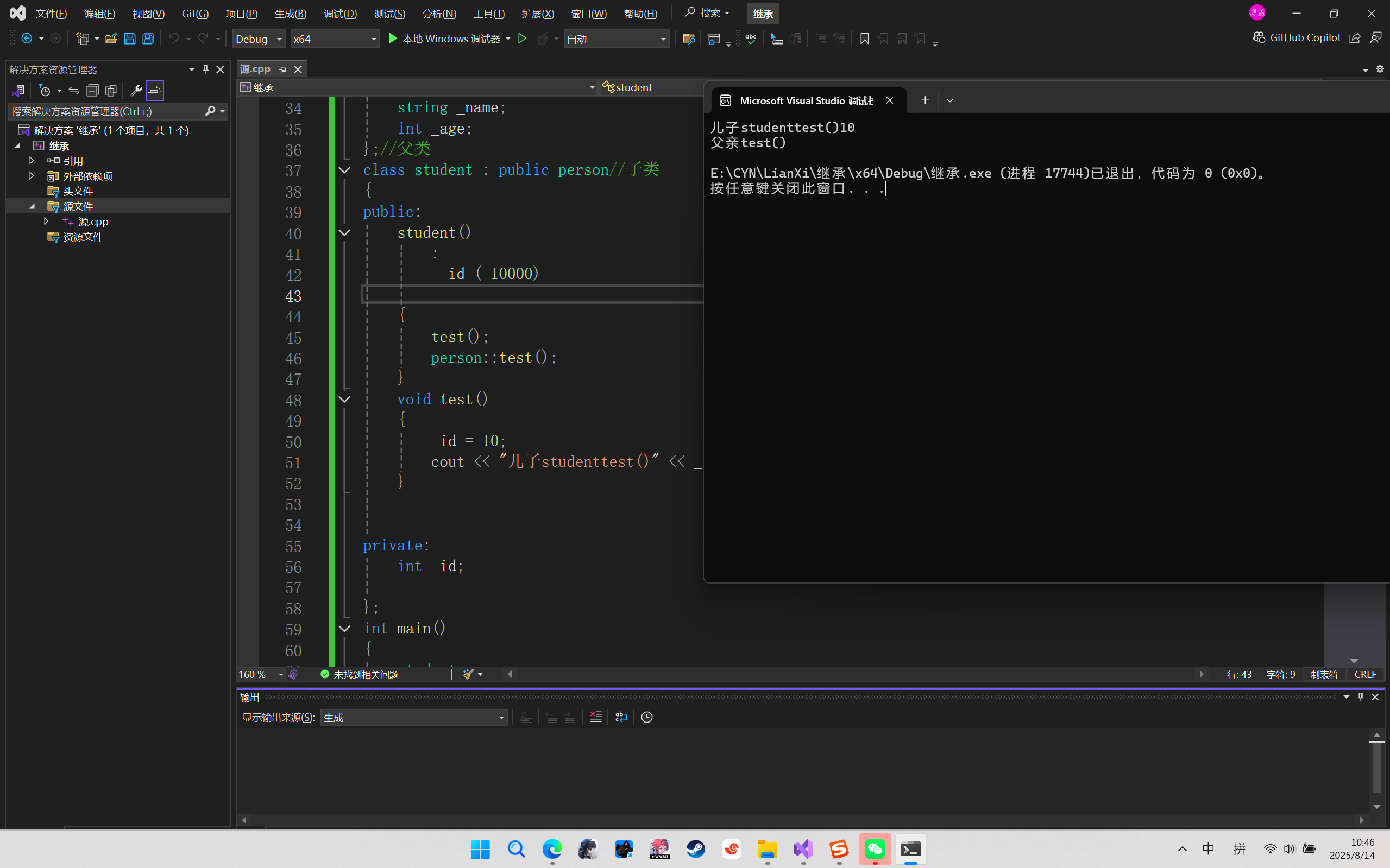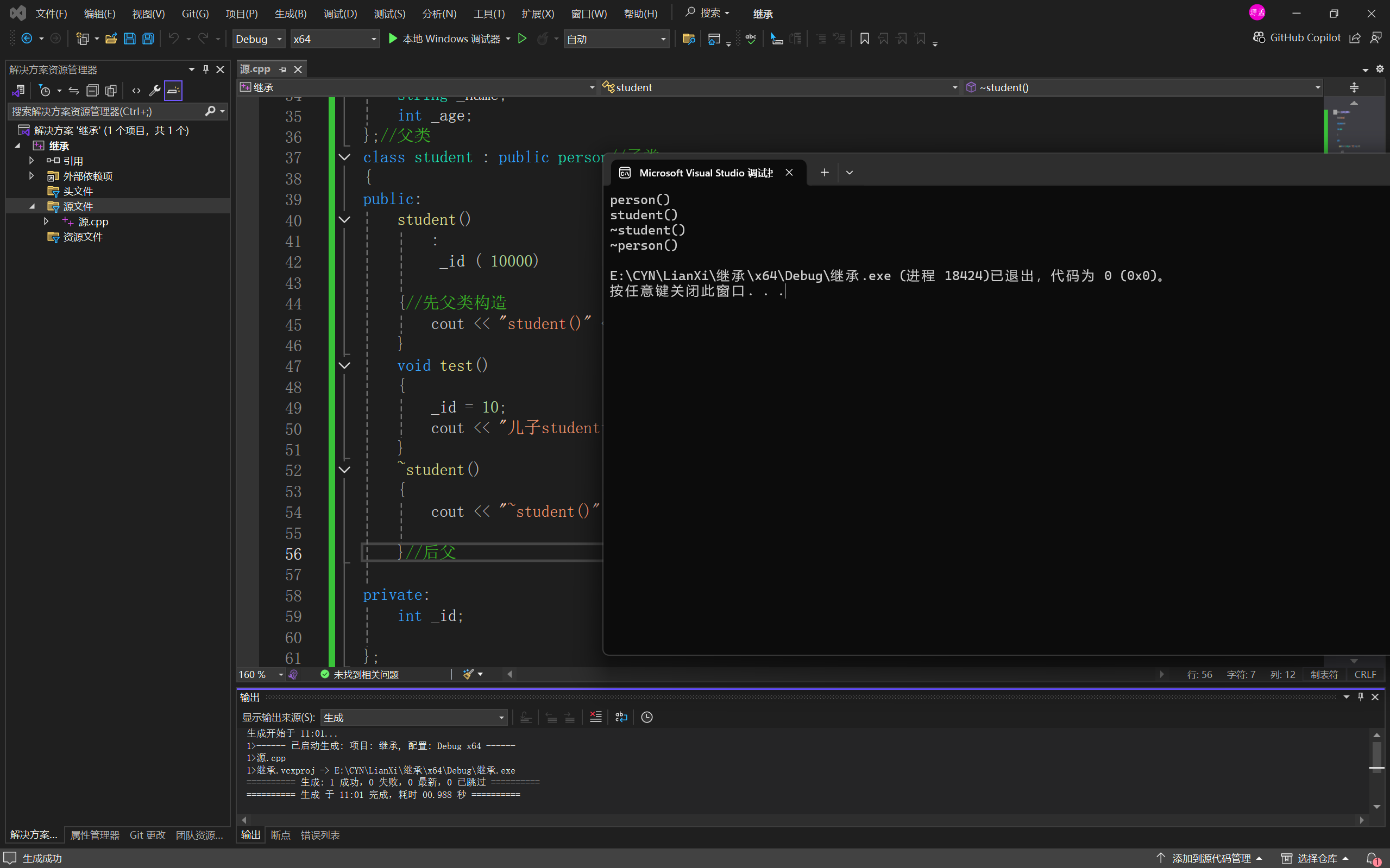 如图写的学生(student)类就是人(person)类的派生类(子类),person类就是student的父类(基类);学生类继承了人类的内部属性以达到也可以使用其内部的test()函数;