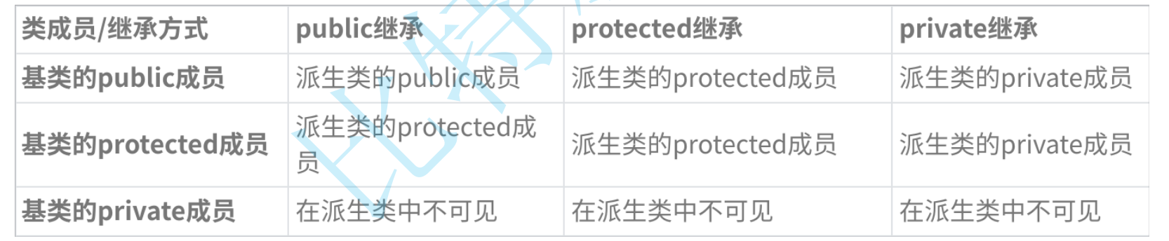 快速记忆:继承的方法全部都是按两者最小的算的,如public继承的protected仍是继承到子类的protected中,而private继承到子类后不可见不可直接由子类调用。