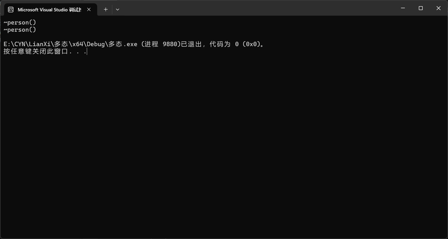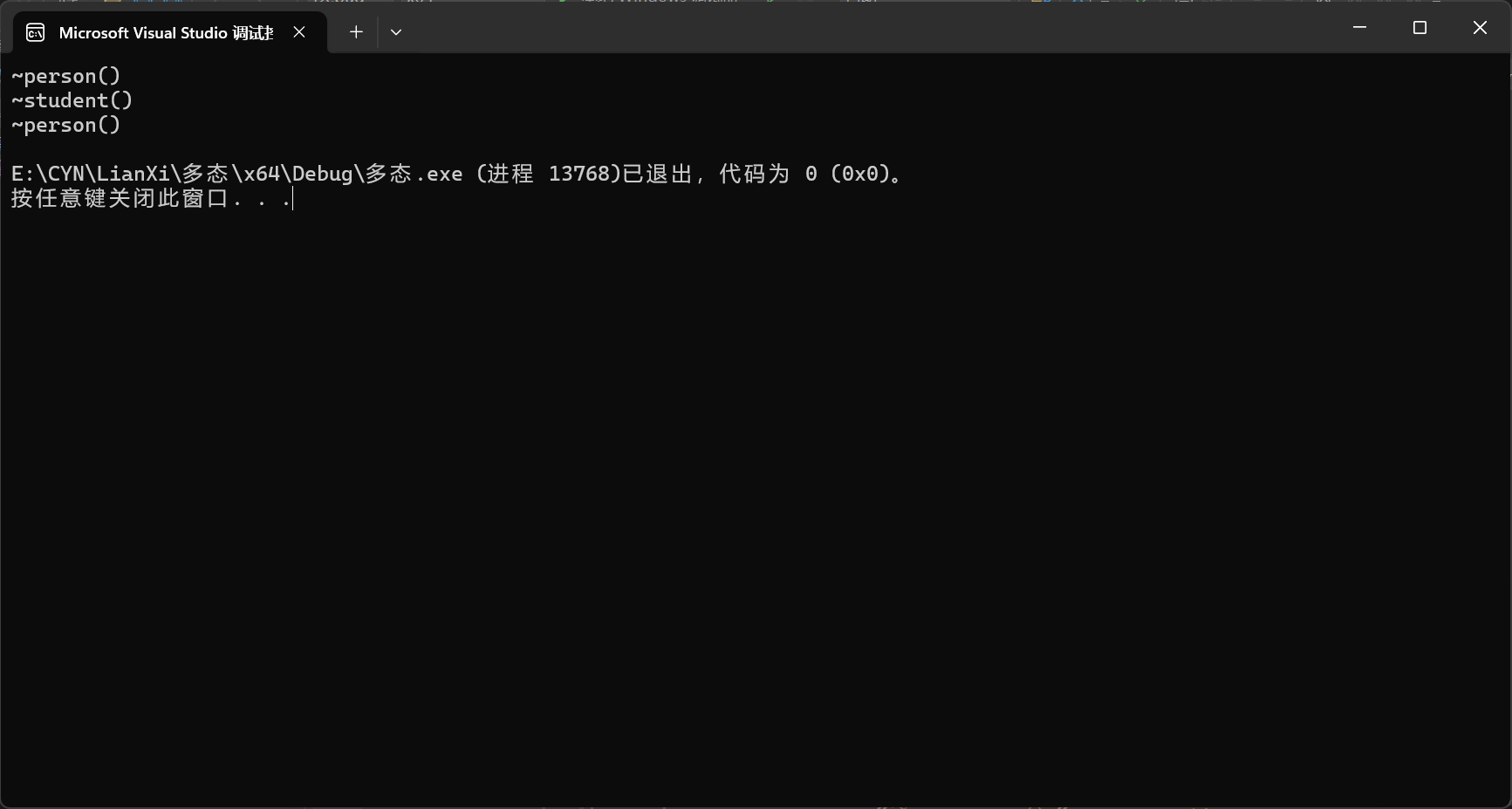 结果为:B->0;首先p是一个student类的指针对象,在p调用text()函数时会使用从父类继承来的text(),而你要知道父类的text()的()中其实是隐藏了一个person* this的在调用时会把p转化成person*类的this,然后this->func()这就达成多态的第一个条件,使用基函数的指针调用虚函数,第二个条件:显然func()是重写过的他俩的参数唯一不一样的就是val=1和val=0(前面提了只要参数类型一样就行),所以构成多态,所以调用student的虚函数。