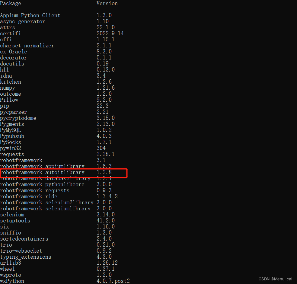 使用pip list命令查看robotframework-autoitlibrary是否安装成功,安装成功后如下图: