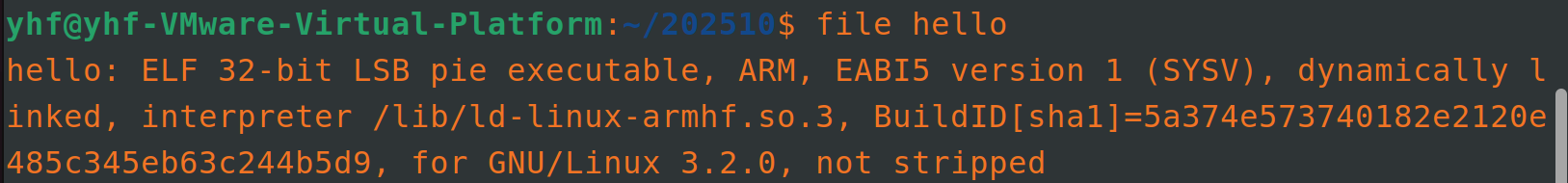 检查:使用 file 命令检查生成的可执行文件,确认它是针对ARM架构的