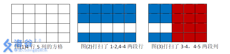 操场可以看成是N 行M 列的方格矩阵,如下图(1)是一个4 行5 列的方格矩阵。每个男生负责打扫一些连续的行,每个女生负责打扫一些连续的列。比如有两个男生,第一个男生负责第1、2 两行、第二个男生负责第4 行,如图(2)的蓝色。打扫的区域可能重复,比如,又有两个女生,第一个女生负责打扫第3、4 两列,第二个女生负责打扫第4、5 两列,如图(3)的红色。从图(3)可以容易看出,有颜色覆盖的方格数为18,即这4 名学生总共打扫了18 个方格。