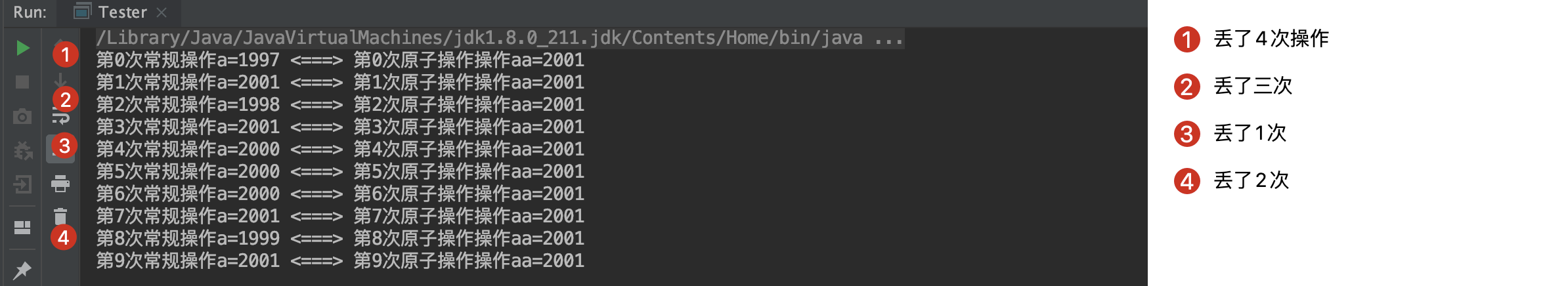 多线程环境下操作会不会有问题呢? 出现了问题。我们看到使用常规操作的a变量出现了数据不一致情况。