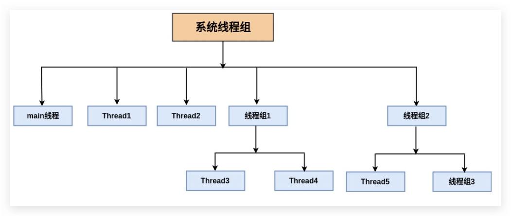 可以把线程归属到某一个线程组中,线程组中可以有线程对象,也可以有线程组,组中还可以有线程,这样的组织结构有点类似于树的形式,如图所示.