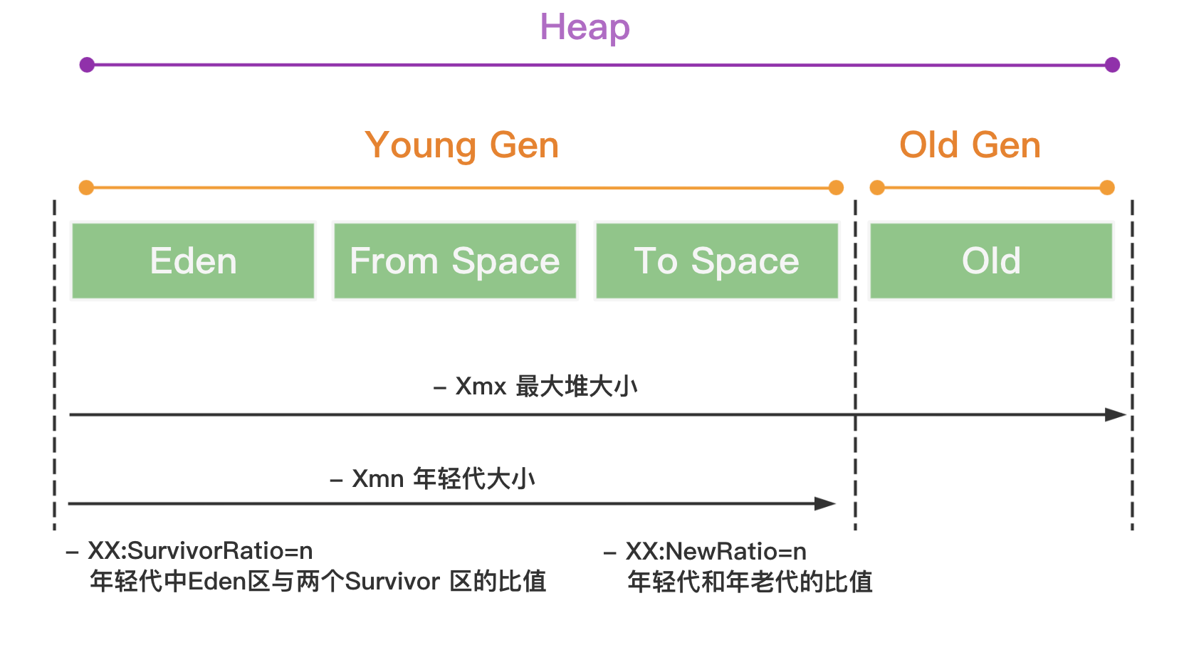 -XX:SurvivorRatio=n | 年轻代中Eden区与两个Survivor区的比值。 | -XX:SurvivorRatio=4,设置年轻代中Eden区与Survivor区的大小比值。如果设置为4,那么两个Survivor区与一个Eden区的比值为2:4,一个Survivor区占整个年轻代的1/6。 |