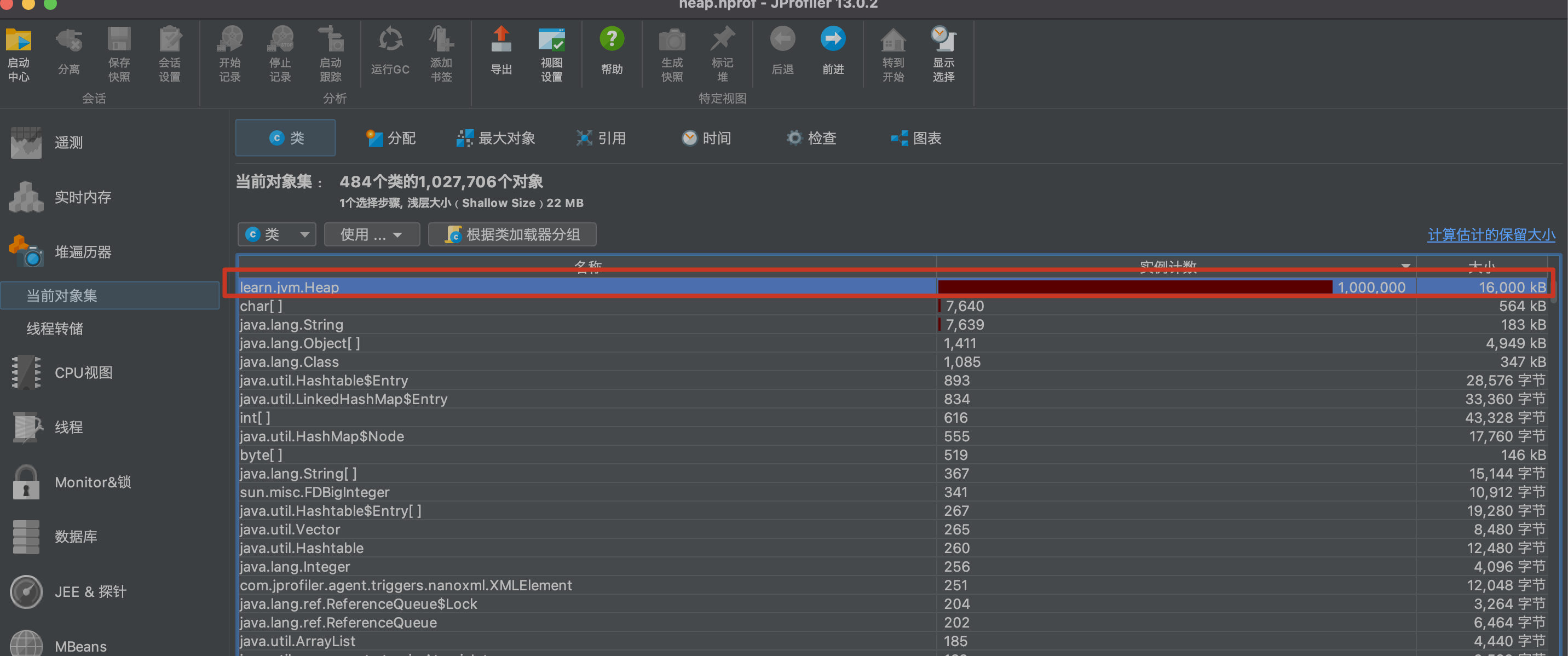 jmap -dump:format=b,file=heap.hprof ${pid} - 打开JProfile 打开文件,直接看到大对象是哪个。