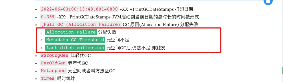 2022-06-03T00:13:48.801-0800-XX:+PrintGCDateStamps 打印日期0.369-XX:+PrintGCDateStamps JVM启动到当前日期的总时长的时间戳形式[Full GC (Allocation Failure)GC 原因(Allocation Failure) 分配失败- Allocation Failure 分配失败